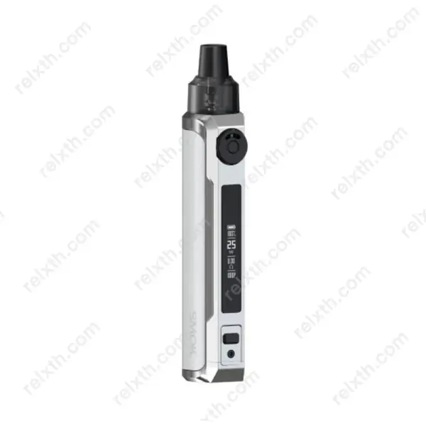 Smok RPM 25W บุหรี่ไฟฟ้าประเภทพอตจากแบรนด์ดังอย่าง Smok เป็นพอตไฟฟ้าที่เรียบง่าย ไม่หวือหวา แต่กลับมีประสิทธิภาพการใช้งานที่ตอบโจทย์สำหรับนักสูบมากๆ เพราะแน่นอนว่านักสูบที่ใช้พอตจะไม่ต้องได้การฟังก์ชั่นมากมาย ซึ่งพอตตัวนี้ให้ได้ในทุกๆสิ่งที่ต้องการ มีขนาดที่เล็ก จับได้ถนัดมือ น้ำหนักเบา จ่ายไฟด้วยระบบอัตโนมัติ สูงสุดที่ 25W ปรับรูลมได้ที่ด้านบนของตัวเครื่อง มีแบตเตอรี่แบบติดตั้งมาในตัวขนาด 900mAh ใช้พอร์ตชาร์จแบบ USB Type-C หน้าจอแสดงผลแบบ LED ขนาด 0.96นิ้ว หัวพอตใช้แบบตรงรุ่น บรรจุน้ำยาบุหรี่ไฟฟ้าได้ 2ml. เป็นระบบการเติมที่ด้านข้าง รองรับคอยล์ LP1 ขนาด 0.9 โอห์ม ให้ฟิลสูบแบบ MTL แนะนำให้ใช้งานกับน้ำยาบุหรี่ไฟฟ้าแบบซอลนิค
